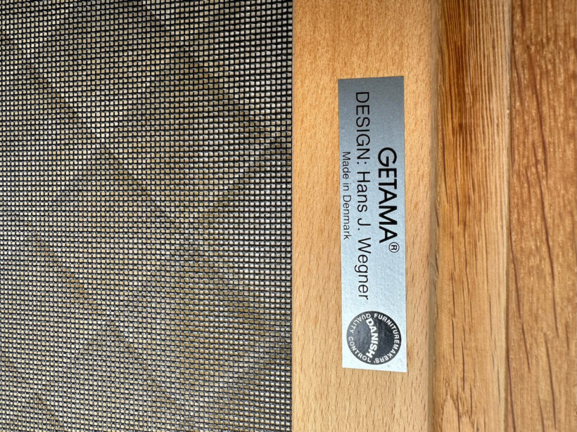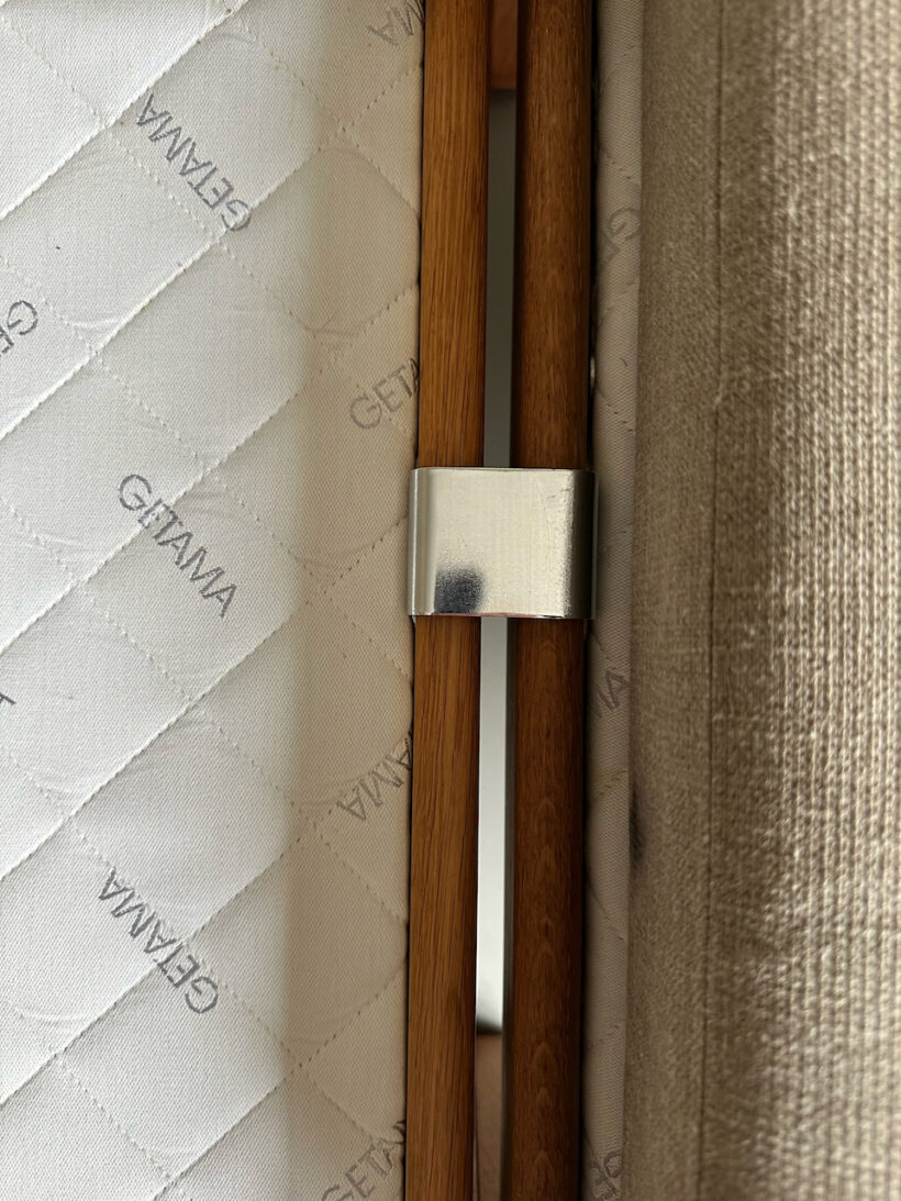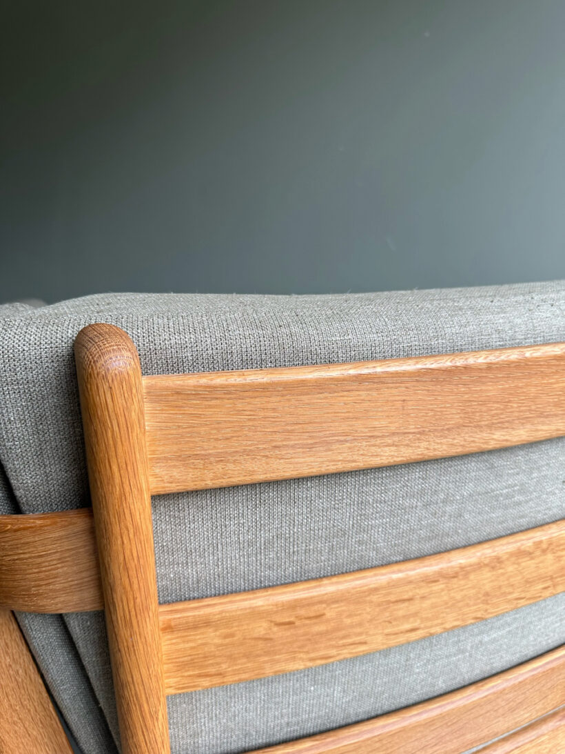 The construction is made of solid oak with wooden cushions in the color greenish grey.
